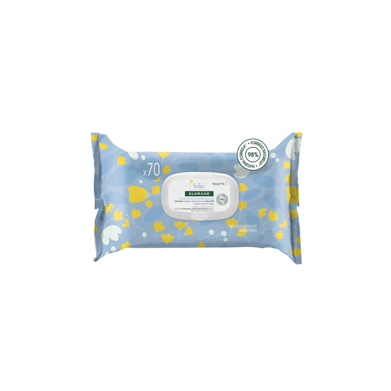 Su fórmula en un 98% de ingredientes de origen natural, con perfume tierno y relajante, limpia con suavidad, hidrata y suaviza. Toallitas con fibras de origen natural y 100% biodegradables.