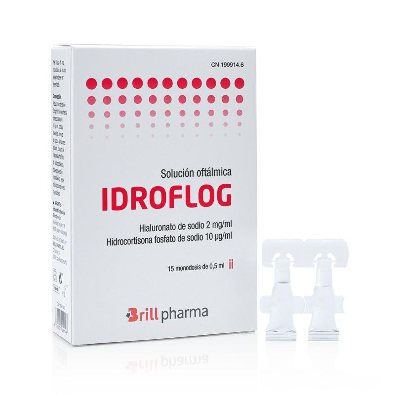 IDROFLOG permite proteger la superficie corneal de la exposición a agresiones externas y, gracias a la acción auxiliar de la hidrocortisona fosfato de sodio (agente corticoide a baja concentración, actividad antiinflamatoria suave y de corta duración de acción), contribuye a controlar la inflamación subclínica en el Ojo Seco.