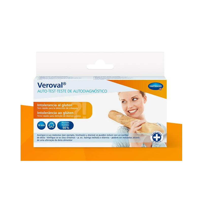 Con el auto-test «Intolerancia al gluten» Veroval®, ahora puede averiguar de forma rápida y segura si su problema es consecuencia de una intolerancia al gluten y, de ese modo, reducir los efectos introduciendo cambios en la dieta. Basta con una gota de sangre del dedo y diez minutos de su tiempo.