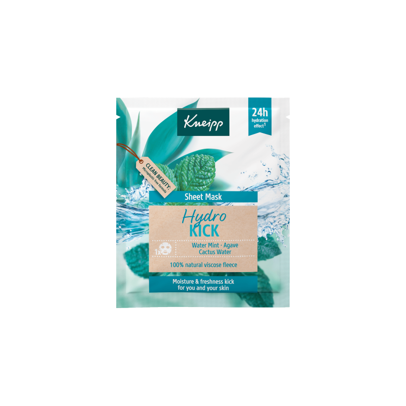 La mascarilla de tejido Kneipp® Hydro Kick con extracto de menta acuática, agave y cactus refresca tu piel y le proporciona la hidratación que necesita. La fórmula de cuidado intensivo con aroma fresco tiene un efecto inmediato: tu piel se siente más tersa e hidratada.