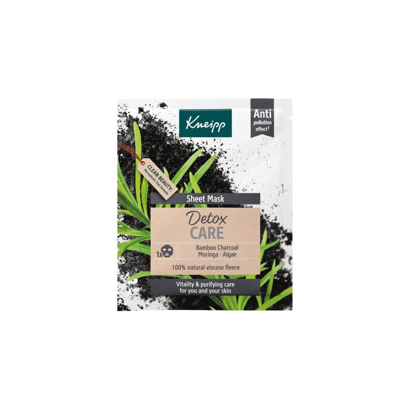 La mascarilla de tela Kneipp® Detox Care con carbón de bambú, algas y extracto de moringa limpia y cuida tu piel en un solo paso. La fórmula purificante con una sutil fragancia libera la piel de los contaminantes ambientales. La piel está nutrida y es visiblemente más firme.