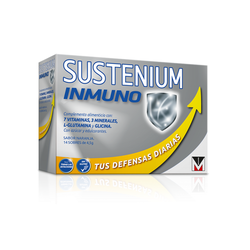 Sustenium Inmuno contiene vitaminas B1, B2, B6 y B12, Ácido pantoténico, Niacina, Vitamina C, Cobre, Zinc, Manganeso, Glutamina y Glicina.