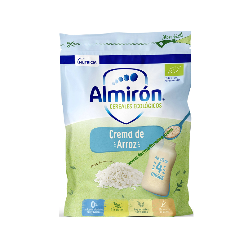 Almirón Cereales Ecológicos Crema de Arroz 200gr es una papilla a base de arroz procedente de la agricultura ecológica que contribuye a diversificar la dieta del bebé a partir de los 4 meses de vida. El arroz es un cereal sin gluten que, gracias a su contenido en vitamina B1, contribuye al metabolismo energético normal del bebé. Almirón Cereales Ecológicos Crema de Arroz solo contiene los azúcares normales presentes de forma natural en los cereales. Almirón Cereales Ecológicos Crema de Arroz se presenta en formato de 200 gramos.