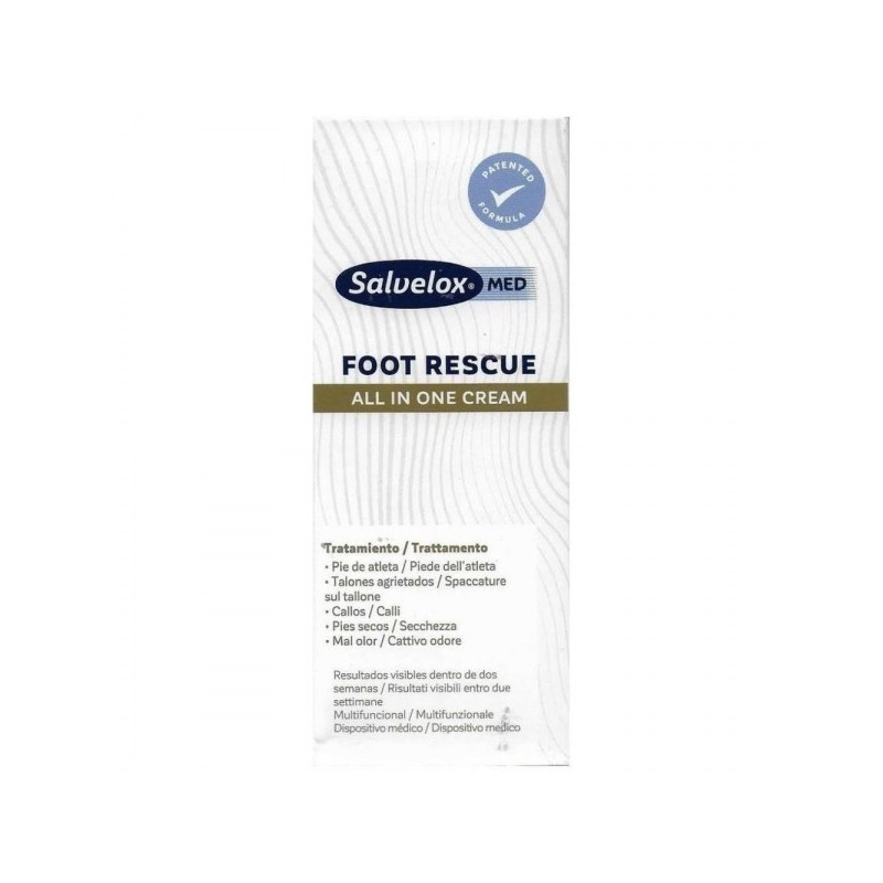 Salvelox Med Foot Rescue Crema Pies 100 Ml Crema todo en uno para el tratamiento de pies: Pie de atleta, talones agrietados, callos, pies secos y mal olor. Es una crema para pies multifuncional para el tratamiento de diversos problemas de los pies como el pie de atleta, los talones agrietados, los callos, la sequedad y el mal olor. Salvelox puede utilizarse para tratar y prevenir la progagación o el empeoramiento de los hongos en los pies, para los talopnes agrietados, los callos y la sequedad.