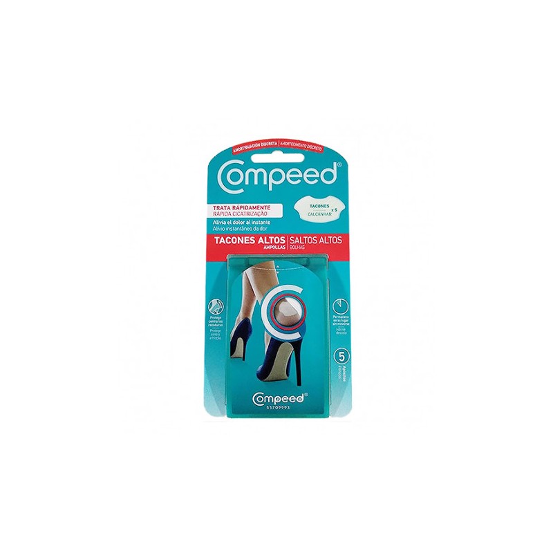 Compeed Ampollas Tacones Altos son apósitos que actúan como una segunda piel, formando un gel protector que ayuda a curar las ampollas en los talones. Producen un alivio instantáneo del dolor y protege frente la presión y las rozaduras. Son resistentes al agua, lo que evita que la herida se infecte y produzca una mayor protección. Además, son tan cómodos que se adaptan perfectamente a los movimientos del tobillo y permanecen en su sitio sin moverse durante varios días. Son ultra finos y discretos.