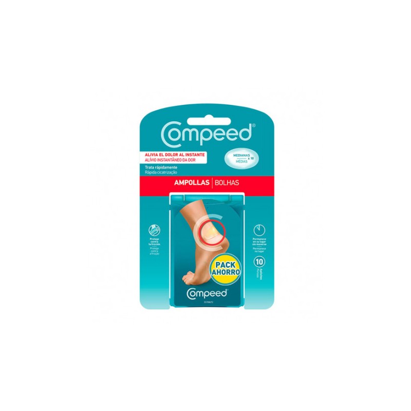 Compeed Ampollas Tamaño Mediano Pack Doble 10 Apósitos desarrolla una avanzada tecnología hidrocoloide, que actúa como una segunda piel formando un gel protector para aliviar el dolor al instante y evitar la fricción. Paralelamente, el apósito genera un entorno óptimo para facilitar una rápida absorción. Este modelo de apósito de Compeed está diseñado específicamente para tratar las ampollas en la zona del talón, donde actúa como una segunda piel que alivia el dolor, protege y amortigua el rozamiento, permite una rápida cicatrización y cubre y sella la herida, evitando la entrada de suciedad y bacterias.