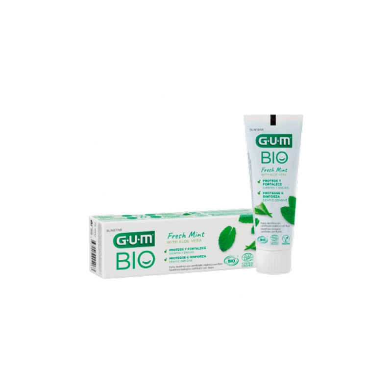 Gum Bio Gel Dentífrico 75ml es una pasta de dientes con un 99% de ingredientes naturales y orgánicos, como el aloe vera y la menta. Su formulación contiene flúor para ayudar a proteger el esmalte contra las caries y fortalece dientes y encías. Cuenta con un agradable sabor a menta fresca. Además, no contiene gluten ni lactosa. Se presenta envasada en una caja de cartón 100% reciclable, hecha de papel 80% reciclado.