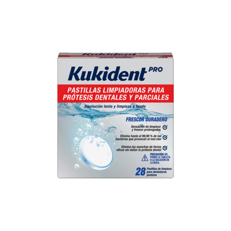 Kukident Pro Pastillas Limpiadoras 28 unidades son unas pastillas que aseguran una limpieza a fondo de las dentaduras gracias a una disolución lenta. Acortan un frescor duradero y una sensación de limpieza ya que elimina el 99,99% de las bacterias que provocan el mal olor. Ejercen una acción anti-bacteriana, anti-placa y blanqueadora. Permiten conservar el brillo y color natural de la dentadura. Además liberan oxígeno activo que previene la formación de sarro, elimina las manchas y aporta una sensación de frescor.