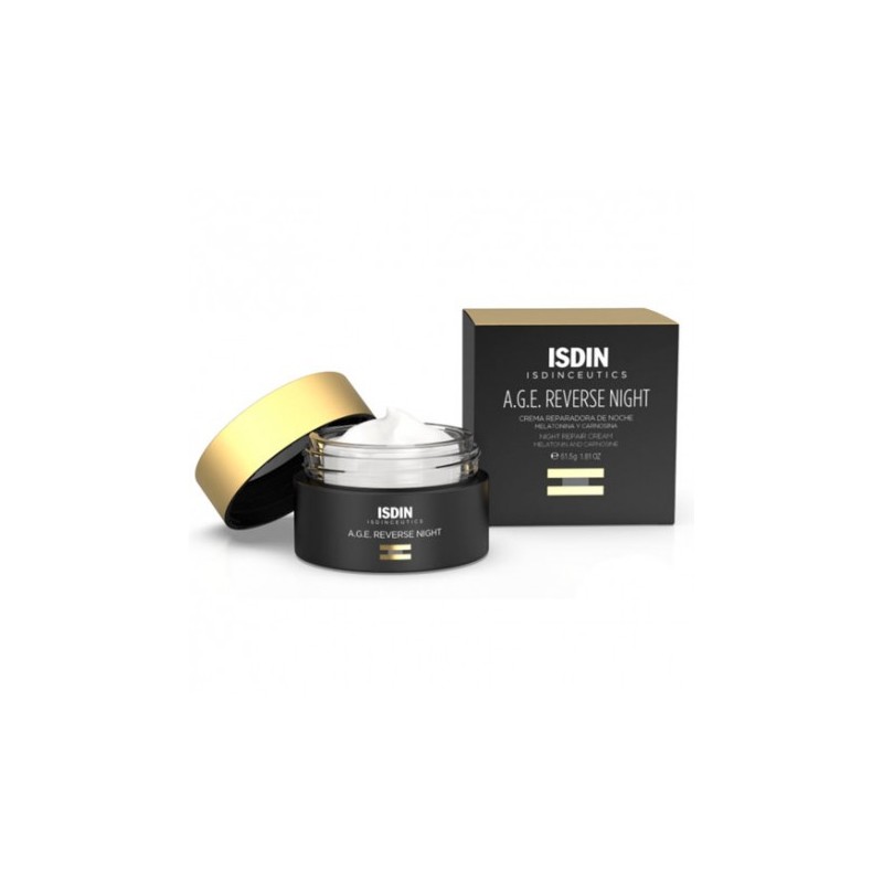 Isdinceutics A.G.E Reverse Night es un tratamiento facial especialmente formulado para el cuidado nocturno. Esta crema contiene melatonina, sustancia natural que estimula las defensas antioxidantes con la finalidad de combatir las agresiones recibidas durante el día. Su contenido en carnosina contribuye a retrasar el proceso de formación de los productos finales de glicación avanzada, conocida como A.G.E., que pueden empeorar la funcionalidad del colágeno y la elastina. Además, este tratamiento de noche tiene helichrysum italicum, un ingrediente que estimula la liberación de moléculas calmantes potenciando la sensación de bienestar instantánea y duradera tras la aplicación.
