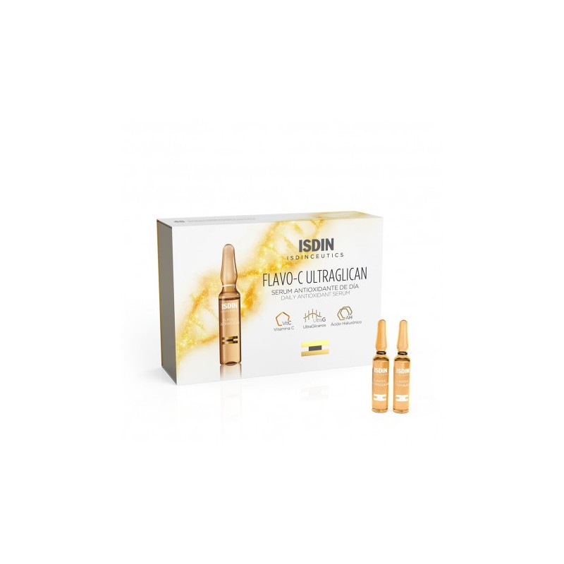 Isdin Flavo-C Sérum Tratamiento Día 10 Ampollas es un sérum que contiene tres activos beneficiosos para la salud diaria de la piel. El primero de estos es la vitamina C, un antioxidante que contribuye a mejorar la protección de la piel contra los radicales libres y reactiva la producción de colágeno.