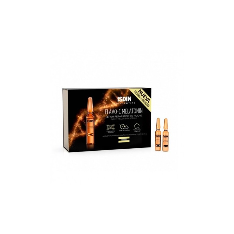 Isdinceutics Flavo-C Melatonin Sérum Reparador Noche 30 Ampollas es una solución en sérum que trabaja en la piel mientras dormimos para reforzar las defensas antioxidantes de la piel. Contiene melatonina para mejorar las defensas antioxidantes de la piel y la deja preparada para luchar contra el estrés oxidativo; bakuchiol para restaurar su flexibilidad y firmeza, y, finalmente, vitamina C para darle luz y potenciar los efectos antioxidantes.