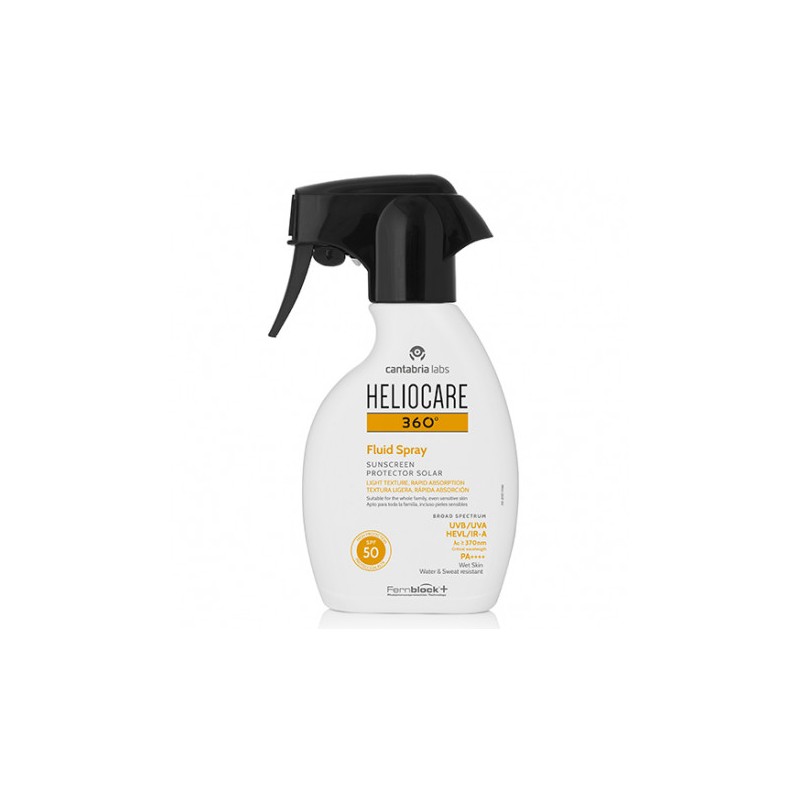 Heliocare 360º Fluid Spray SPF50 250ml se trata de un fotoprotector en formato de spray preparado para todo tipo de pieles. Protege frente a las 4 radiaciones (UVB, UVA, Visible e Infrarroja). Además, ha sido desarrollado con la Fernblock+ acompañada de activos reparadores y antioxidantes, que neutralizan y reparan el daño solar. Es de una gran tolerancia cutánea. Se encuentra testado bajo control dermatológico y oftalmológico.