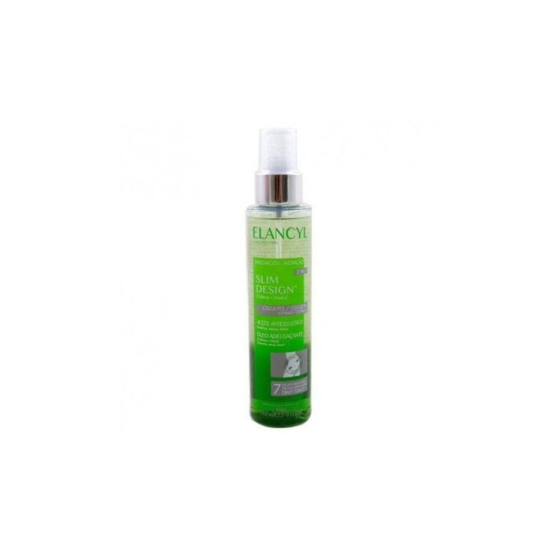Slim Design Aceite Anticelulítico ofrece resultados en solo siete días. Reducción clínicamente testada. Este producto de Elancyl no contiene parabenos. Su pulverizador hacer que sea de fácil aplicación y que no se desperdicie el producto.