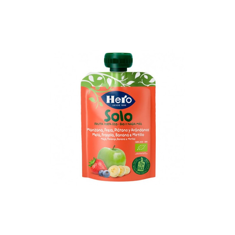 Hero ECO Bolsa Manzana/Fresa/Plátano/Arándanos Solo ECO 100g para tu bebé. El ritmo de vida de tu bebé aumenta constantemente, y también cambia su alimentación como es el caso de la fruta. A esta edad, además, tu pequeño ya será suficientemente mayor para pasar largos ratos fuera de casa. Para todas estas características, Hero ha creado estos productos. Formulados únicamente con productos naturales ecológicos y en formato para llevar, estas bolsitas de frutas 100% ecológicas pueden ser tu mejor aliado.