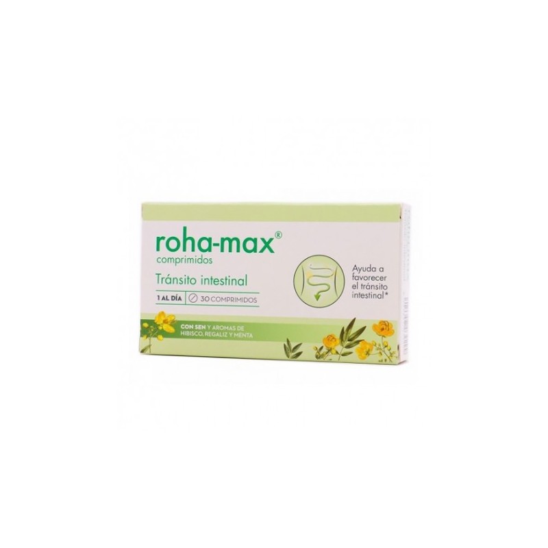 Roha Max Tránsito Intestinal 30 comprimidos es un complemento alimenticio a base de hojas de sen y aromas de hibisco, regaliz y menta, que ayuda al mantenimiento normal del tránsito intestinal. Roha Max Tránsito Intestinal se presenta en formato de 30 comprimidos.