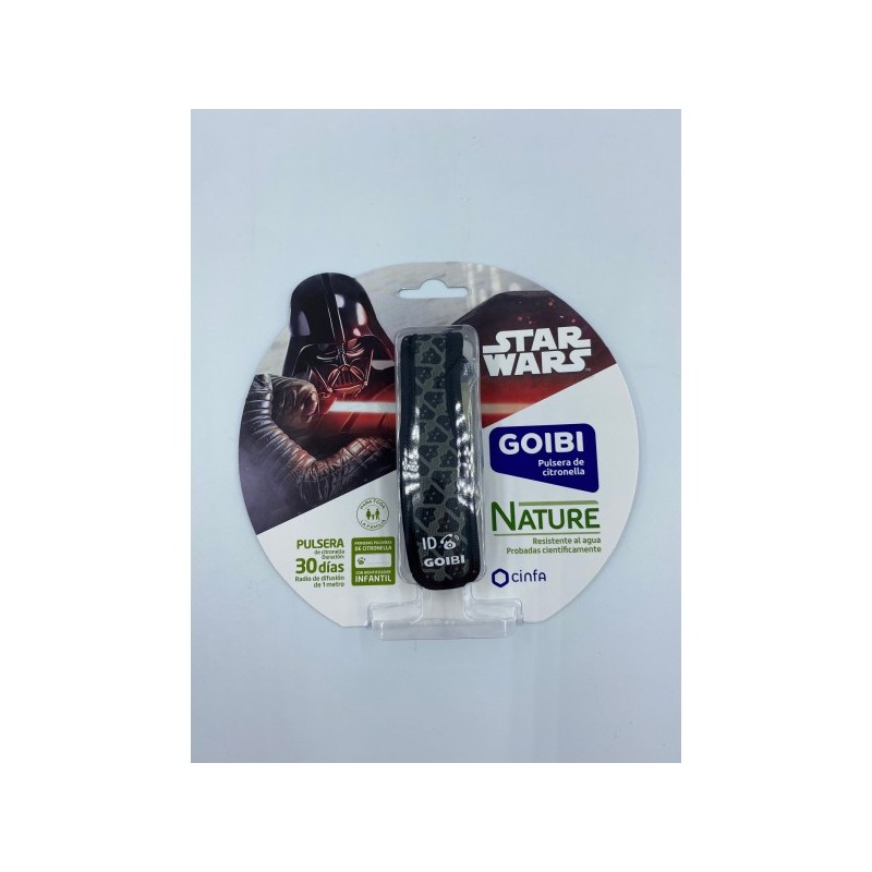 Pulsera antimosquitos de la colección Star Wars, con el dibujo del casco de Darth Vader. Las pulseras de citronela Goibi, gracias a su radio de difusión de 1 metro, son idóneas para toda la familia para realizar actividades al aire libre.Son resistentes al agua. Con dos recambios que permiten una duración de 30 días. Para niños mayores de 3 años. Además, llevan incorporado un identificador infantil.