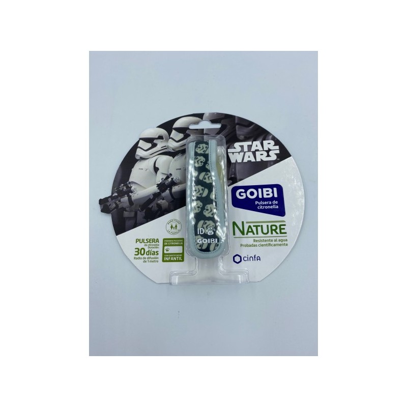 Pulsera antimosquitos de la colección Star Wars. Las pulseras de citronela Goibi, gracias a su radio de difusión de 1 metro, son idóneas para toda la familia para realizar actividades al aire libre. Son resistentes al agua. Con dos recambios que permiten una duración de 30 días. Para niños mayores de 3 años. Además, llevan incorporado un identificador infantil.