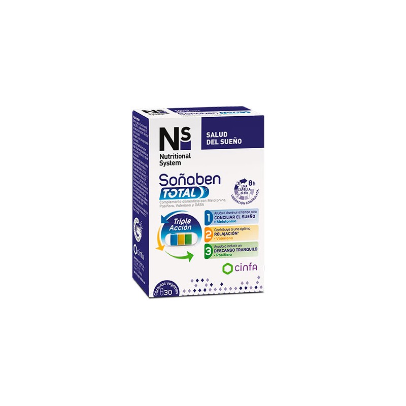 Ns Soñaben Total encapsula 4 mini-comprimidos con distintos tiempos de liberación, que actúa sobre las problemáticas más frecuentes del sueño para dormir bien y despertarse mejor. Los comprimidos de liberación inmediata, tienen todos los ingredientes activos: melatonina, GABA, valeriana y pasiflora para disminuir el tiempo para conciliar el sueño contribuyendo a una óptima relajación. Por otro lado, el comprimido de liberación prolongada, ayuda a inducir un descanso tranquilo, gracias a la pasifora, para lograr un sueño reparador.