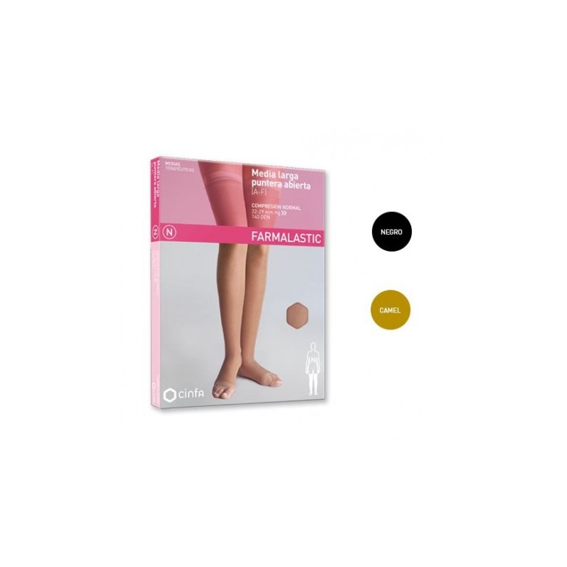 Media Larga Compresión Normal Farmalastic Puntera Abierta Negro Talla Pequeña, consiste en unas medias hasta el muslo con blonda de compresión normal y con la puntera abierta indicadas en personas que sufren de problemas de circulación, pesadez de piernas, embarazadas o como alternativa al panty en épocas de mucho calor.