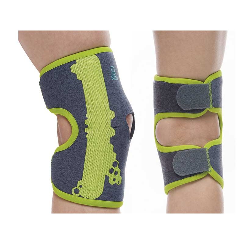 Rodete rotuliano removible. Centra y estabiliza la rótula evitando movimientos indeseados. Ballenas laterales de acero en espiral. Estabilizan la articulación de la rodilla en sentido medio-lateral permitiendo la libertad del movimiento en la flexo-extensión. Cierres micro-gancho posteriores. Adaptan la ortesis dejando libre el hueco poplíteo para mayor comodidad. Bilateral.