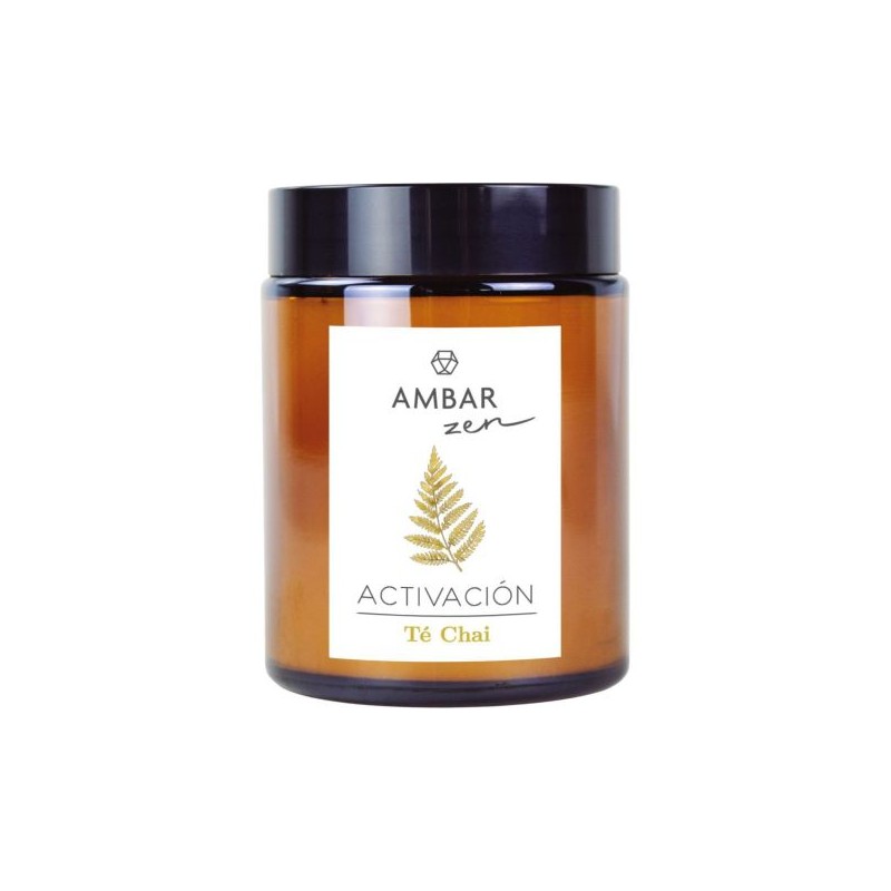 Vela perfumada “Té Chai” de Ambar Zen, con un aroma cálido y especiado que crea un ambiente acogedor, relajante y lleno de bienestar.