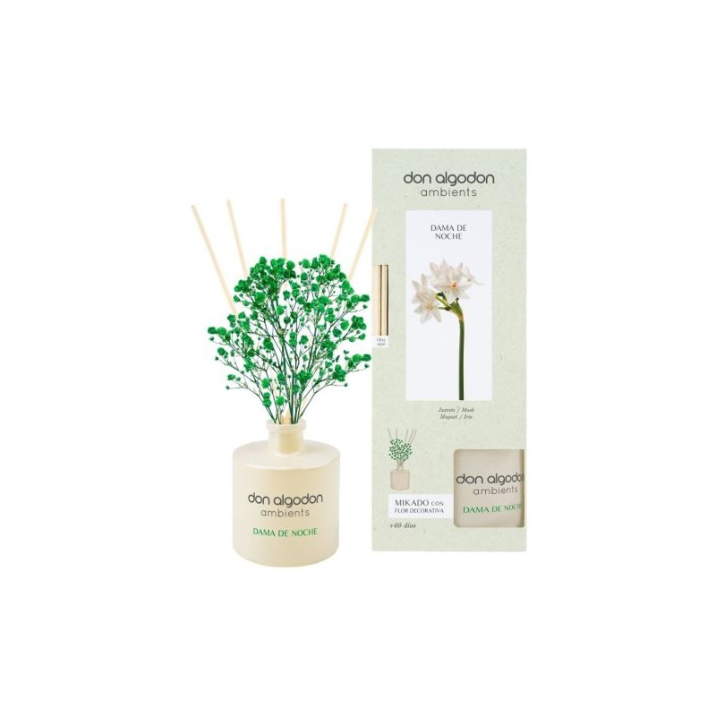 El Mikado Don Algodón Jazmín aporta a cualquier estancia un aroma floral suave y envolvente, inspirado en la elegancia natural del jazmín. Su fragancia fresca y delicada crea un ambiente acogedor y relajante, ideal para salones, dormitorios, baños o cualquier espacio interior que se quiera perfumar de forma sutil y constante.