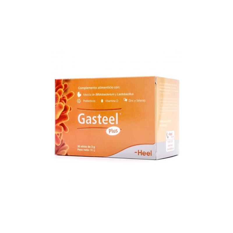 GASTEEL PLUS® ES UN COMPLEMENTO ALIMENTICIO que está compuesto por una mezcla de Bifidobacterias y Lactobacillus, que contribuyen a mantener el equilibrio de la microbiota intestinal, fructooligosacáridos, vitamina D y minerales (Zinc y Selenio).