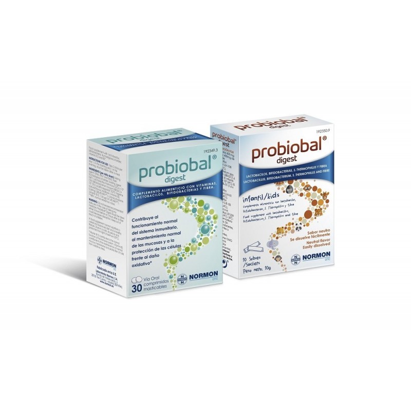 Probiobal® digest infantil es un complemento alimenticio con Lactobacillus helveticus LLH-108 + Bifidobacterium spp. (B. bifidum LBB-02) + B. infantis LBI -04 + B. longum LBL-01 + Lactobacillus acidophilus LLA-01 + Lactobacillus bulgaricus LLB -05 + Streptococcus thermophilus LST-229 + fibra, formulado especialmente para niños a partir de 6 meses.