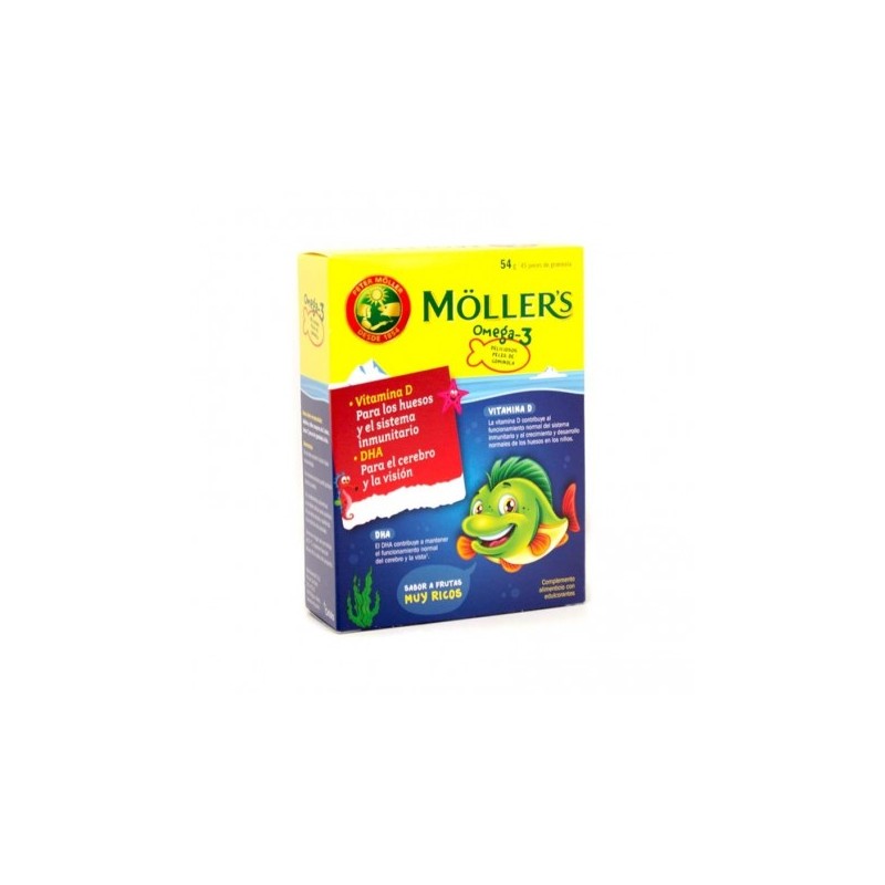Moller's Omega 3 Vitamina D 45 Peces de Gominola es un complemento alimenticio a base de Omega 3 (EPA y DHA) y Vitamina D.