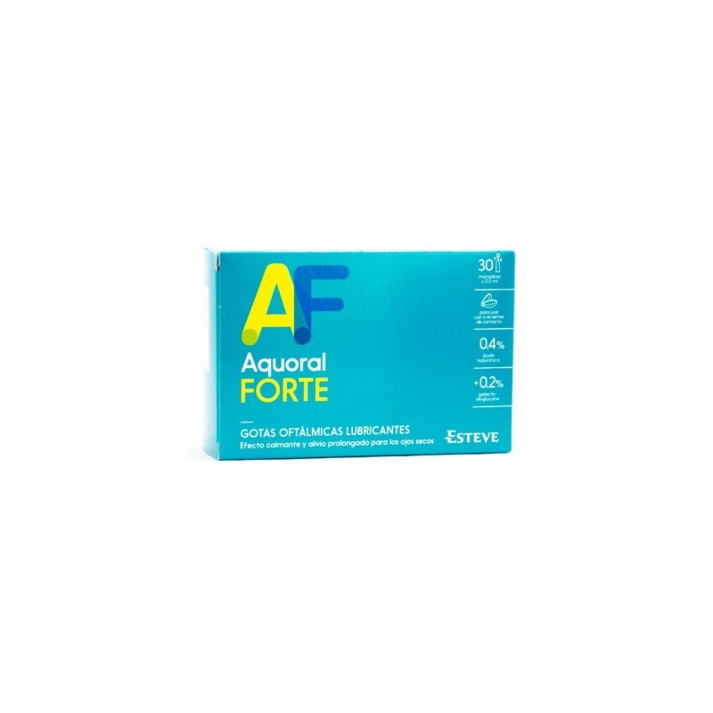 Aquoral Forte Gotas Oftalmológicas 30 Monodosis 0,5ml son unas gotas humectante para los ojos secos, irritados, con picor o lagrimeo. Su fórmula a base de Ácido hialurónico (0.4%), sódio fosfato, cloruro sódico y agua proporcionan lubricación y humedad al ojo, aportando una mayor hidratación al ojo seco o irritado. Su textura es más viscosa, lo cual confiere propiedades lubricantes, hidratante y protectoras. Y gracias al ácido hialurónico se alivia la irritación, la sequead, el picor. El ácido hialurónico en soluciones para los ojos secos, proporciona una mayor hidratación, generando propiedades lubricante y de estabilidad enla película lagrimal.
