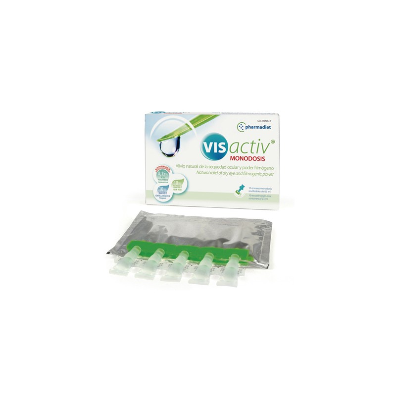 VIS ACTIV® es una solución estéril hipoosmolar de uso oftálmico, con pH fisiológico, a base de aguas destiladas de Aloe vera (10%) y de Centella asiatica (10%), con Ácido Hialurónico de alto peso molecular (0,15%), presentado en prácticos envases monodosis de 0,5 ml.