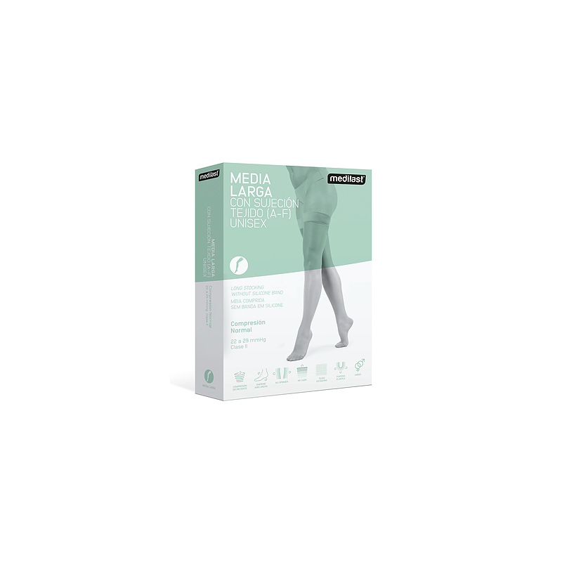 Media larga de compresión normal de 22 a 29 mmHg con sujeción en tejido, ideal para aquellas personas que la silicona no les resulta cómoda.